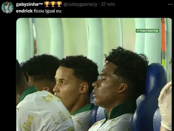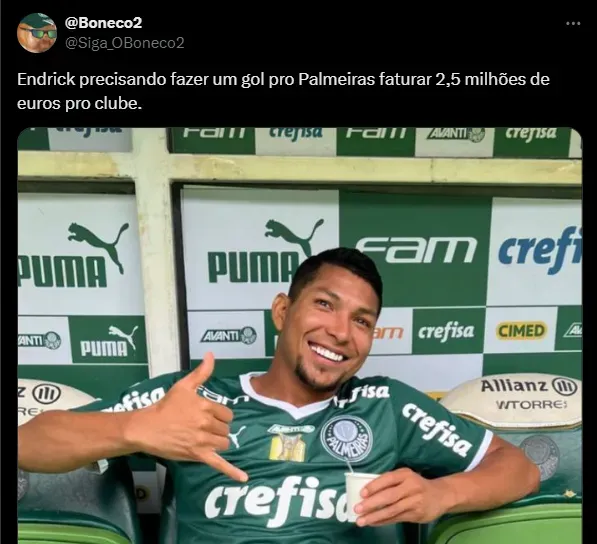 “Endrick precisando fazer um gol pro Palmeiras faturar 2,5 milhões de euros pro clube…”, “Se sou o Endrick chuto o balde, e posto a foto do título brasileiro com a legenda (ganhei sozinho)” e “Tinha que tirar do bolso do Abel essa grana se ele não fizer…”, foram alguns comentários.