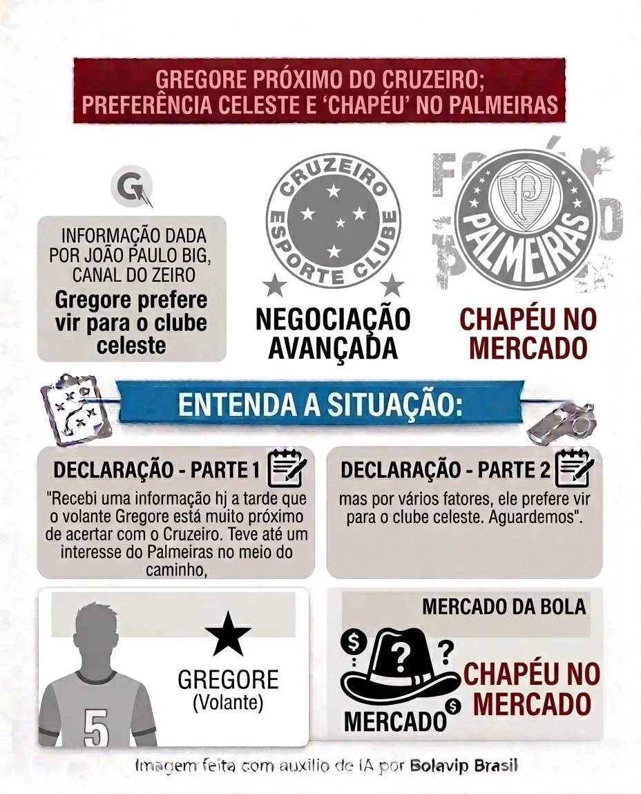 “Recebi uma informação hj a tarde que o volante Gregore está muito próximo de acertar com o Cruzeiro, iniciou o comunicador, admitindo que a Raposa deve vencer a concorrência do Alviverde Paulista: