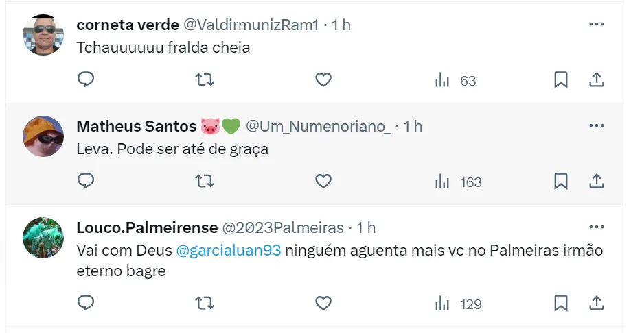 Com isso, os palmeirenses nas redes sociais estão pedindo para a presidente Leila Pereira aceitar fazer negócio com o Grêmio e se desfazer do atleta de 30 anos. Os torcedores acreditam que o zagueiro não serve mais para o Verdão.