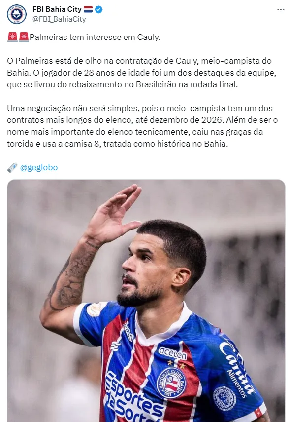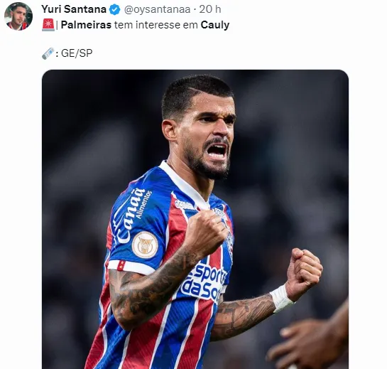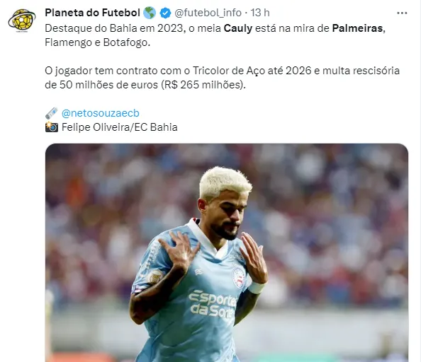 De acordo com informações publicadas pelo site FogãoNet, o meia Cauly, do Bahia, que tem sua SAF controlada pelo Grupo City, estaria na mira do Palmeiras. Além do Verdão, Botafogo e Flamengo também querem o jogador.
