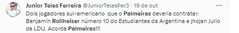 Em vídeo publicado no seu canal do YouTube, o jornalista palmeirense, Felippe Facincani sugeriu a contratação de um meia ao Alviverde Paulista para a temporada de 2024. Trata-se do meia Rollheiser, do Estudiantes, da Argentina.