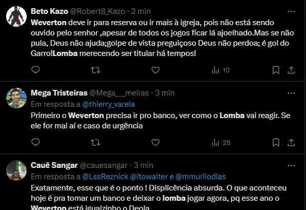 “Eu acho que Marcelo Lomba é uma opção melhor do que Weverton“, “Weverton vem falhando muito ultimamente, inclusive não pega pênalti. Tá na hora de deixar o Lomba né ?” e “Time que quer ganhar não pode ter Rony e Weverton… Lomba já pediu passagem a anos“, foram alguns comentários.