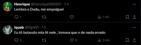 “Que baita contratação”, “Lembra o Dudu, me empolguei”, “Eu tô botando muita fé nele, tomara que não dê nada errado” e “Simplesmente a reencarnação do Valdivia”, foram alguns comentários.