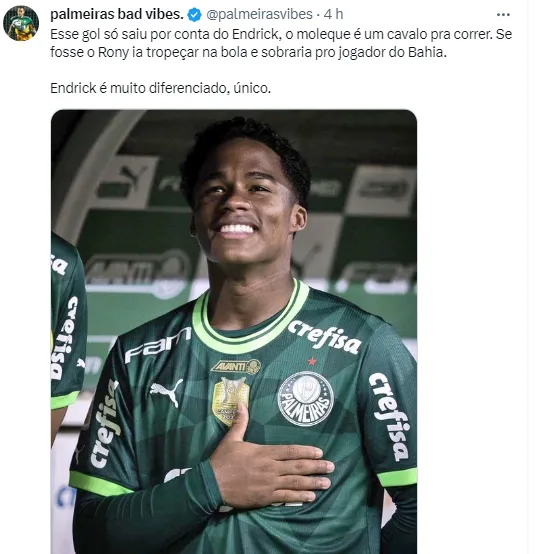 Endrick, a joia da base Alviverde, elogiou o parceiro: “Uma honra jogar ao teu lado, ídolo. Obrigado por tudo e por todos os conselhos. Você é o melhor, príncipe”, escreveu o garoto.