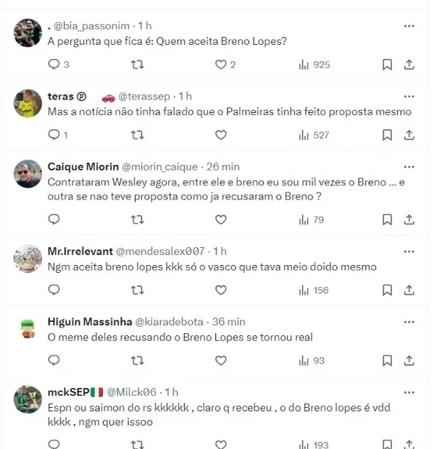 “Conversei com outras pessoas que garantem que é real o interesse, mas nenhuma oferta foi apresentada de forma oficial. Inter não aceita Breno Lopes”, escreveu o jornalista Saimon Bianchini em sua conta oficial no X (antigo Twitter).