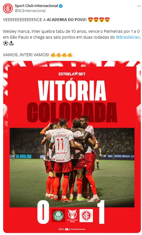 O Internacional venceu o Palmeiras, por 1 a 0, nesta quarta-feira (17). Os times se enfrentaram na Arena Barueri, em São Paulo. A partida foi válida pela segunda rodada do Campeonato Brasileiro.