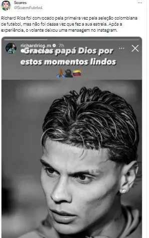 Em postagem em seu perfil oficial no Instagram, mesmo sem ter recebido oportunidades dentro de campo, o jovem meio-campista colombiano se manifestou sobre a chance de ser convocado. “Obrigado pai Deus por esses lindos momentos. Fé que tudo vem”.