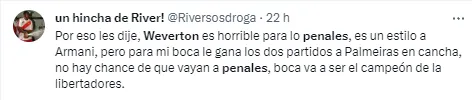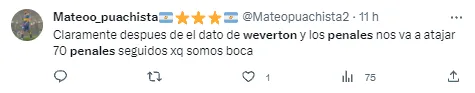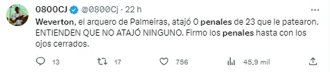 Como qualquer jogador de posição diferente, Weverton tem suas especialidades e pênaltis não é exatamente uma delas. O que os próprios adeptos do Boca Juniors reconheceram é que o goleiro é um craque. Inclusive, os argentinos temem até que o ponto de dificuldade do craque seja superado na Libertadores, numa previsão pessimista que mostra o medo que os adversários têm pelo Palmeiras. Os alviverdes não querem esquentar a cabeça com isso e só pensam na classificação.
