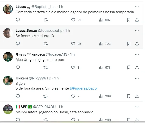 Foram dois gols, uma assistência, um passe decisivo, uma grande chance criada. Foram seis bolas recuperadas, não houveram faltas. Diante do bom desempenho, Piquerez recebeu do Sofascore a melhor nota, sendo 9,3. Com isso, o uruguaio coroa uma de suas melhores atuações (se não a melhor), com a camisa do Palmeiras.