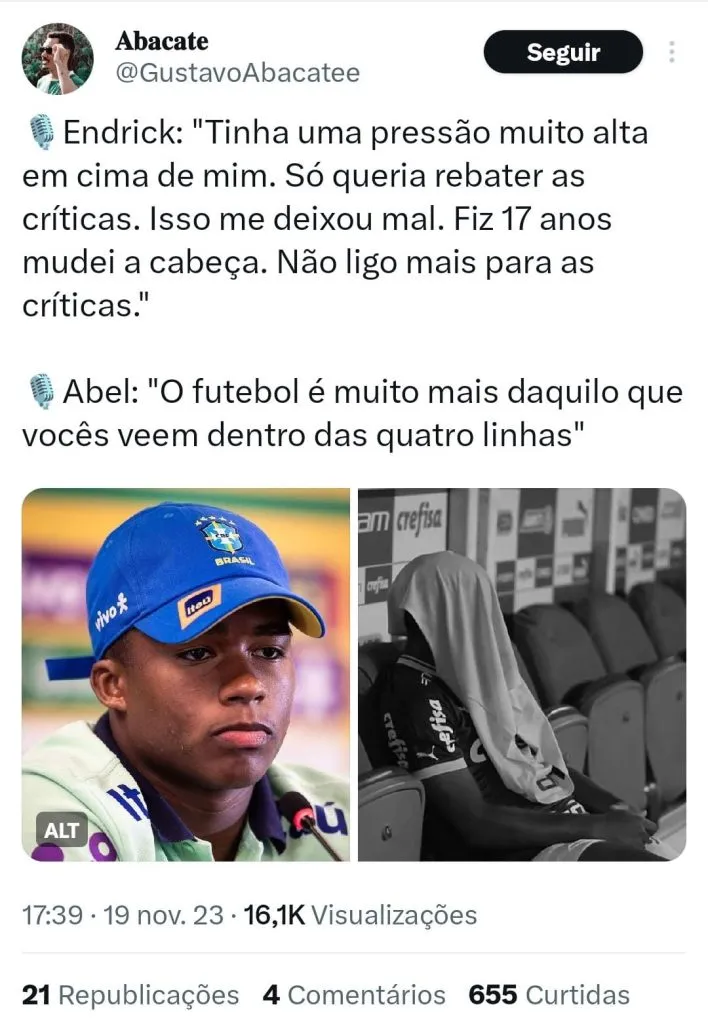 Durante a coletiva, Endrick também admitiu que ficou abalado com as cobranças que recebeu. “Eu tinha 16 anos, pensava em tudo que saia na mídia, pensava nisso, ouvia as pessoas falando, jogava com raiva, para mostrar que eu era outra pessoa, que não era aquilo.”, contou.