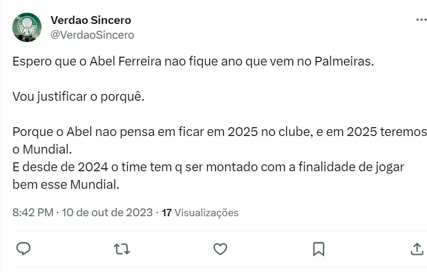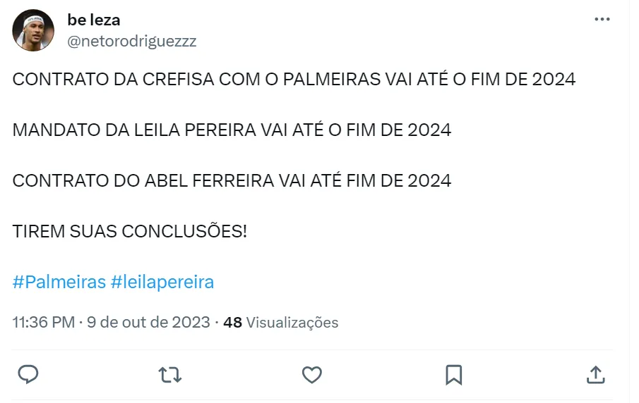 “Eu não tenho cartas de corte, mudando muito drasticamente. Mas eu tenho uma carta que traz esse afastamento, essa saída dele, ainda não concretizada porque eu acredito que exista um força, que pode ser da própria instituição para segurar esse trabalho. Mas não vai ser muito fácil não. Tem uma dificuldade. Eu apostaria que o Abel em 2024 saia do Palmeiras, que ele não permaneça”, completou Mariana Fonseca.