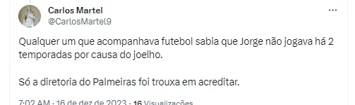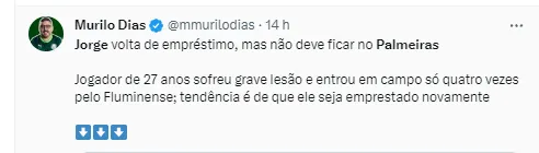 “O Eduardo Uram, seu representante, garante que não é esse número, mas já ouvi de gente importante no Palmeiras que, entre salário, direitos de imagem e luvas, o pacote completo do Jorge chega em R$ 1 milhão por mês”, finalizou.