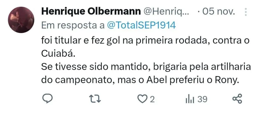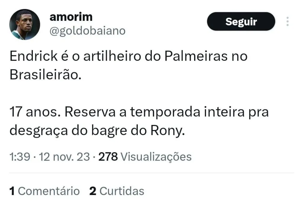 “O Endrick entrou na equipe como lá atrás muita gente pediu. Mas ele (Abel Ferreira) falou que o Endrick teria o momento dele. Acho que o momento chegou, em um momento que ele está em evolução. Foi quando o Rony caiu um pouco de produção, aí perderam o Dudu. São atletas que têm a confiança do seu treinador”, comentou.