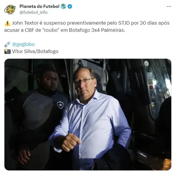 “O STJD acatou nesta sexta-feira (3) o pedido da Procuradoria de Justiça Desportiva e suspendeu preventivamente por 30 dias o presidente da SAF Botafogo, John Textor, e o vice-presidente do clube, Vinicius Assumpção”, diz o trecho.