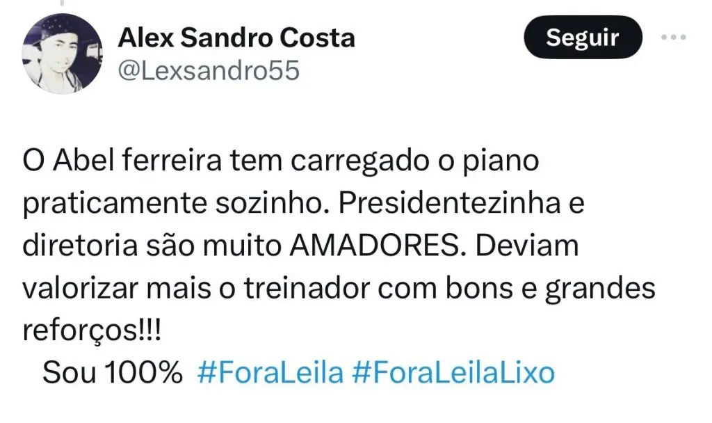“Lamento que em 2022 a presidente Leila não pensou de forma inclusiva e em promover a paz nos estádios. Na ocasião, após o término da final do Paulistão, não houve qualquer comoção ou pedido de desculpas da instituição sobre ato homofóbico em relação ao São Paulo Futebol Clube”, reagiu o presidente, lembrando outros casos em que Leila não teve postura condizente com a fala.