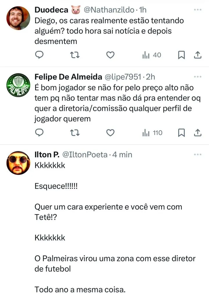 Segundo o setorista Diego Firmino, o Palmeiras nunca fez proposta por Tetê, não tem a intenção de fazer e isso não deve mudar no futuro. O profissional ainda informa que o Alviverde procura anunciar um meia-atacante e um ponta em breve.