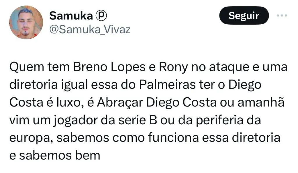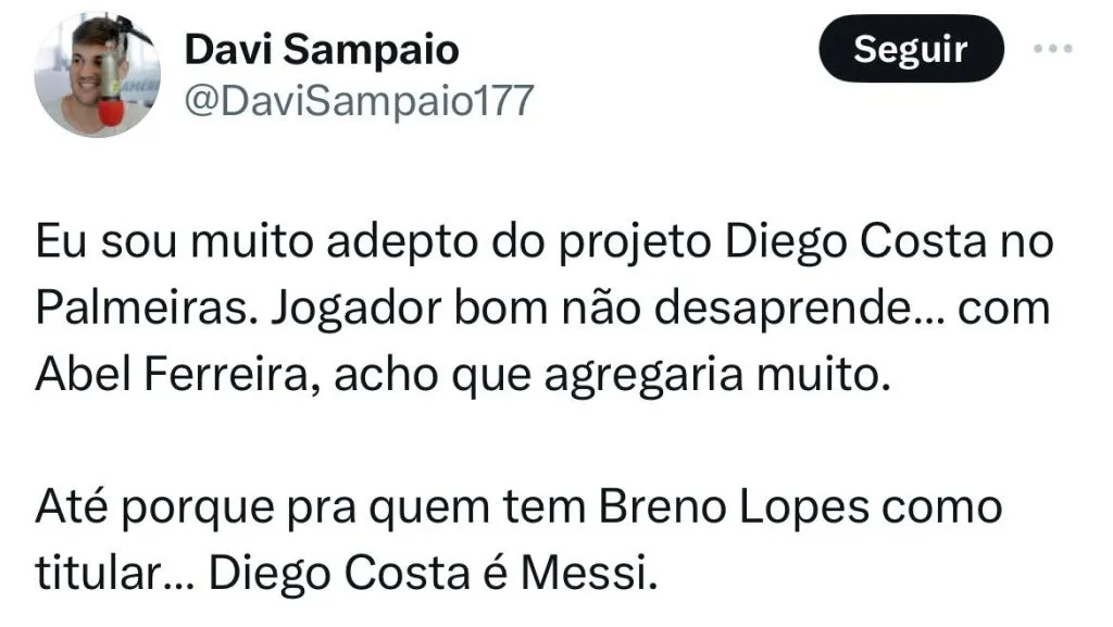 Mas, o assunto do momento na Academia de Futebol é Diego Costa. Após Abel ter dito que quer o camisa 9 para o lugar de Endrick e que seja experiente e brasileiro, o jogador foi muito comentado nas redes sociais.