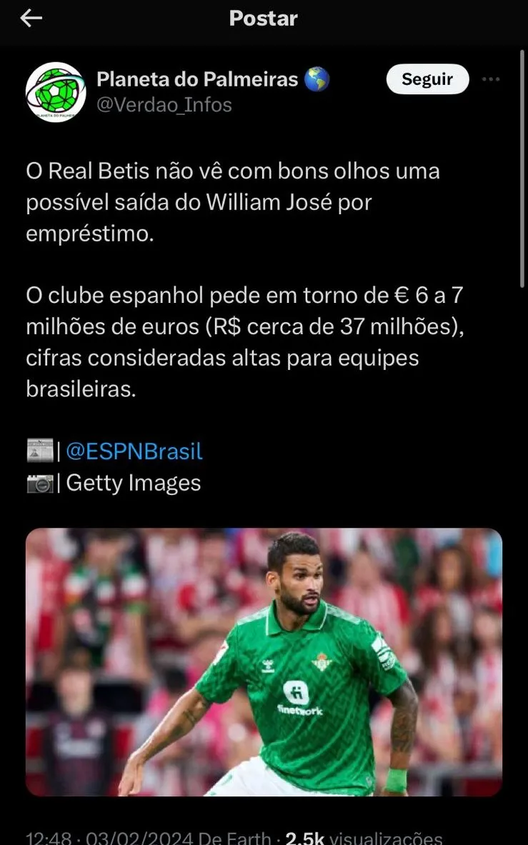 Porém, por mais que haja essa vontade do jogador em vestir a camisa do Verdão, o Bétis não se empolgou com a proposta apresentada pelo Clube comandado por Leila Pereira.