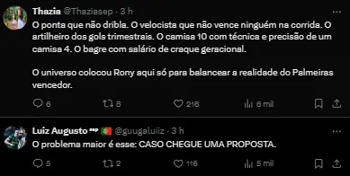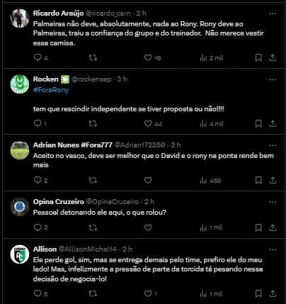 Um outro ponto em relação à torcida do Verdão, é que os torcedores do Palestra estão se mostrando favoráveis a uma possível saída do jogador, que não vem bem pelo Clube.