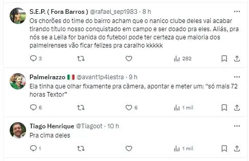 O pedido de punição exemplar também veio com uma alfinetada referente ao duelo entra Palmeiras e Botafogo no Brasileirão de 2023, quando o Verdão aplicou uma virada surpreendente sobre a equipe carioca, em pleno Estádio Nilton Santos, o que para Leila, foi o gatilho para que Textor iniciasse sua série de acusações.