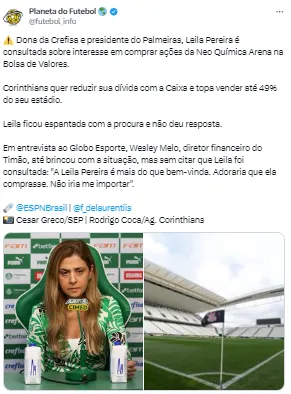 Leila Pereira comprar a arena do Corinthians? Sei não hein…😅 #Palmeiras #Corinthians https://t.co/LnF4djVXiV pic.twitter.com/2FBYNVL19X