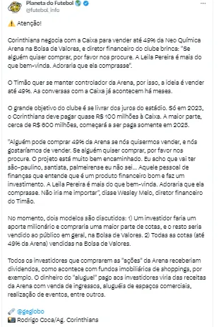 Porém, a apuração expôs que Leila não quis seguir adiante nas conversas. Aconteceu uma conversa informal e a dirigente se manifestou não querendo evoluir na conversa sobre a possibilidade de adquirir parte dos direitos da arena.
