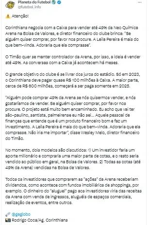 Porém, a apuração expôs que Leila não quis seguir adiante nas conversas. Aconteceu uma conversa informal e a dirigente se manifestou não querendo evoluir na conversa sobre a possibilidade de adquirir parte dos direitos da arena.