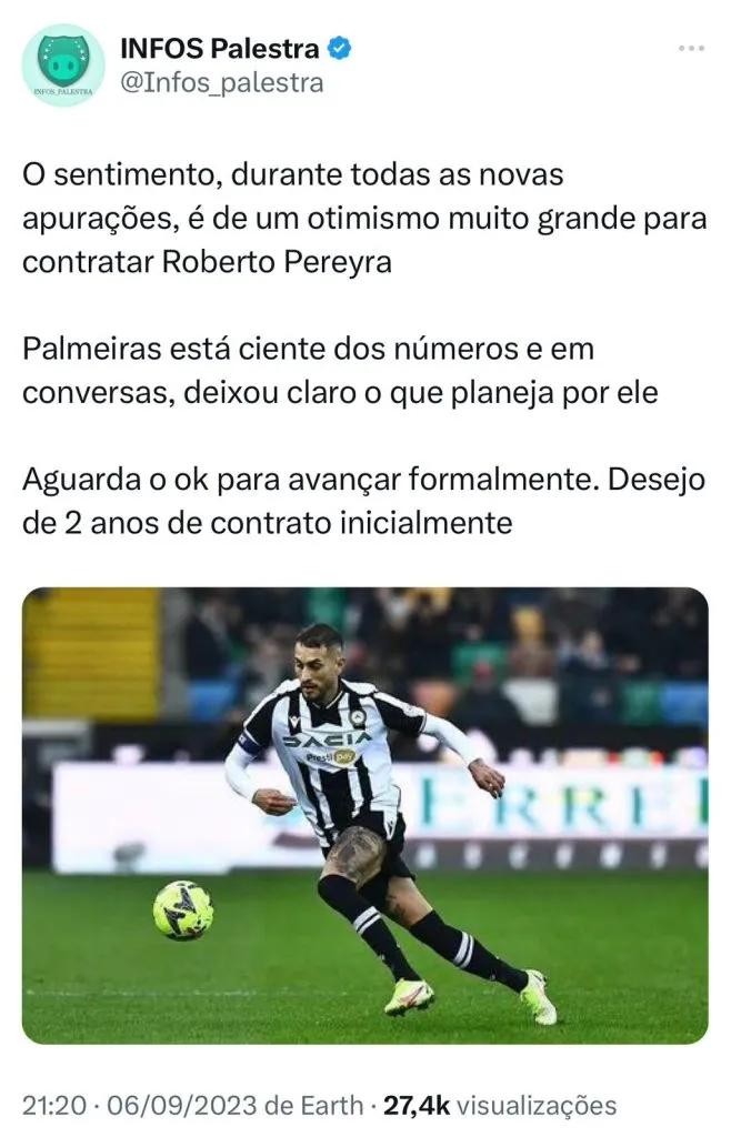 De acordo com apuração do portal Nosso Palestra, é que existe no Palmeiras um otimismo muito grande de fechar com o argentino por alguns motivos: o primeiro é que Roberto Pereyra está inclinado a jogar no Verdão, o segundo é que Leila e Anderson Barros estão cientes dos números e em conversas, deixou claro o que planeja por ele. Por fim, o contrato até 2025 é algo que agrada a todos neste momento.