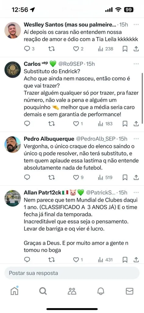 Mas, um assunto no pré-jogo revoltou bastante a torcida do Palmeiras: reforços. Isso porque Leila Pereira apareceu e deu pistas que o Alviverde não fará movimentação no próximo mercado da bola. O assunto gerou debate nas redes sociais.