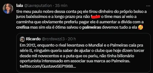 A presidente do Palmeiras e da Crefisa, Leila Pereira, tem como objetivo quitar totalmente a dívida até o final de seu mandato no próximo ano. Em cenários otimistas, a expectativa é que, com a eventual conquista da Libertadores ainda este ano, o clube possa se aproximar de zerar o passivo financeiro.