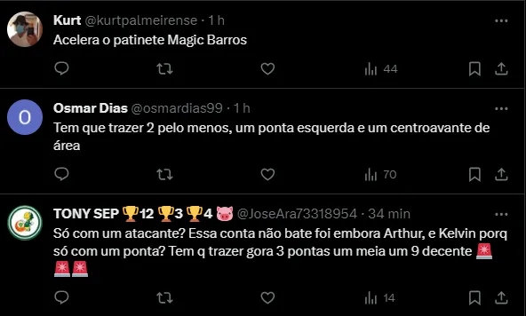 O Palmeiras já estava procurando um jogador para a posição com a venda de Arthur ao Zenit, mas agora, sem ter Bruno Rodrigues, o Verdão quer um atacante já nesta janela de transferências.
