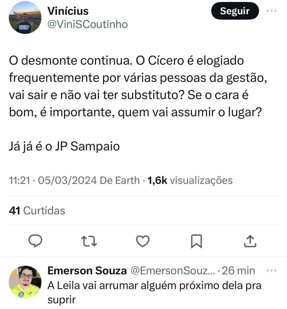A torcida do Palmeiras lamentou a decisão de Leila Pereira nos bastidores: “O desmonte continua. O Cícero é elogiado frequentemente por várias pessoas da gestão, vai sair e não vai ter substituto? Se o cara é bom, é importante, quem vai assumir o lugar? Já já é o JP Sampaio”, lamentou um internauta.