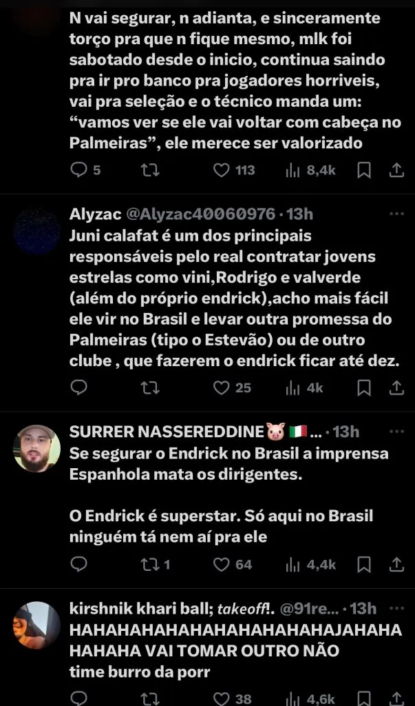 A presidente vê a possibilidade de negociar com base nesses números para que o jovem fique. Endrick quanto o clube espanhol querem que o atleta se junte ao elenco blanco já na próxima pré-temporada.