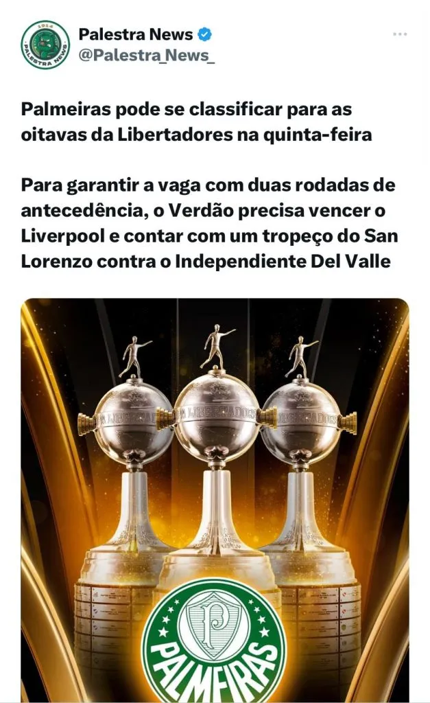 Nesta quinta-feira (9), o Palmeiras encara o Liverpool, do Uruguai, pela quarta rodada da fase de grupos da Copa Libertadores. O jogo será às 19h, no Estádio Centenário, em Montevidéu.