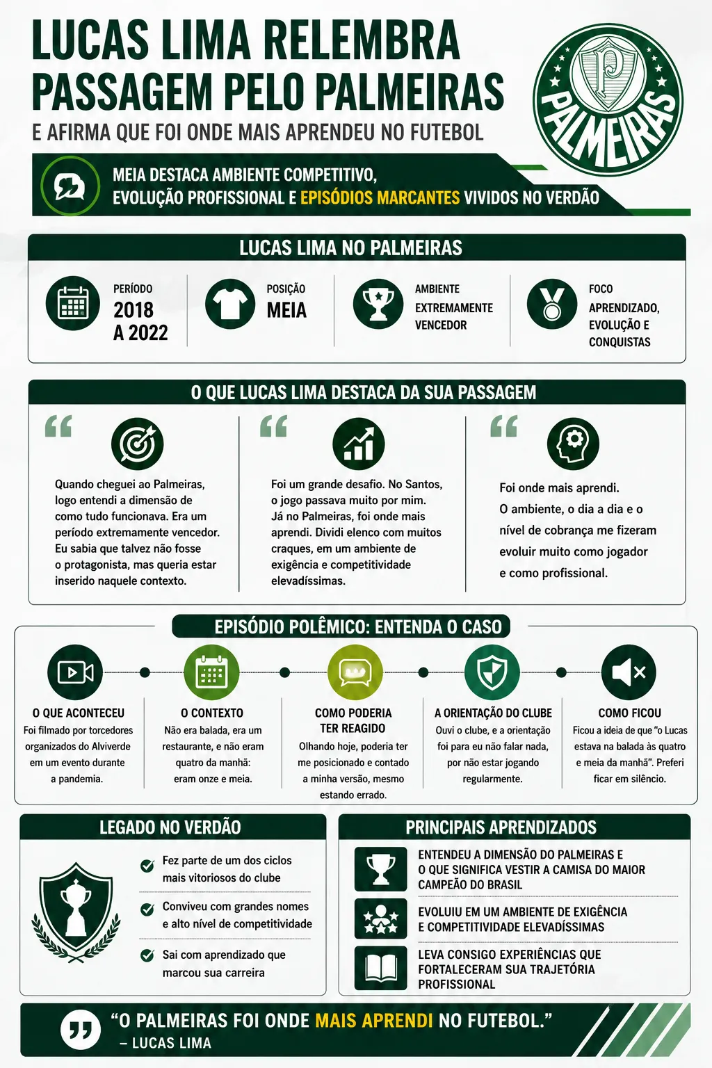 E, enquanto os atuais atletas do Verdão buscam novas vitórias e títulos pelo clube, o meia Lucas Lima, atualmente no Goiás-GO, relembrou alguns episódios vividos no clube, que defendeu entre 2018 e 2022. O atleta destacou, principalmente, o aprendizado no maior campeão brasileiro.