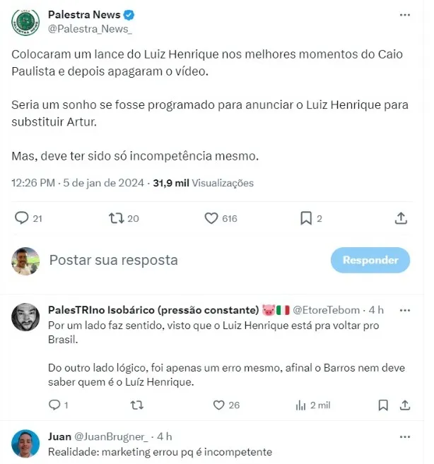 O Palmeiras colocou um lance do Luiz Henrique achando que era o Caio Paulista e no vídeo de anúncio do lateral-esquerdo, causando uma grande comoção dos torcedores nas redes sociais.