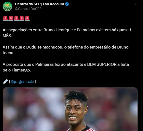 “Chequei com uma fonte minha do Palmeiras e quero acrescentar algumas informações. As negociações entre Bruno Henrique e Palmeiras existem há mais de um mês. Assim que o Dudu se machucou, o telefone do empresário do jogador tocou. A proposta que o Palmeiras fez ao Bruno Henrique é bem superior a feita pelo Flamengo, que já foi recusada pelo staff do jogador. A pessoa que eu conversei falou o segunite: ‘O Palmeiras não entrou de brincadeira nessa história”, disse Nicola.