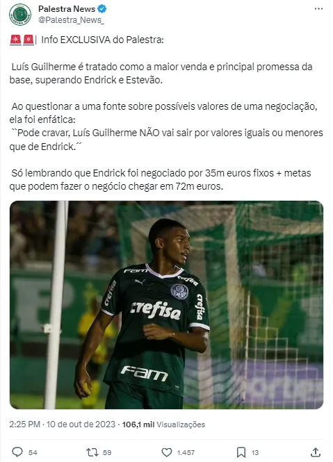 De acordo com informação publicada pela página Palestra News no Twitter, Luís Guilherme pode deixar o Palmeiras por valores superiores aos que envolveram a venda de Endrick. A publicação foi feita a partir de uma fonte exclusiva do portal, que deixou clara a intenção do Verdão em realizar a maior venda da história da instituição. Segundo a pessoas ouvida: “Pode cravar, Luís Guilherme NÃO vai sair por valores iguais ou menores que de Endrick”.