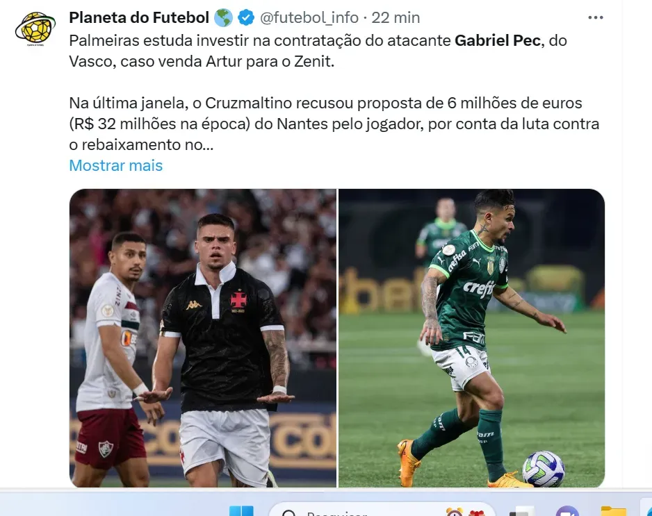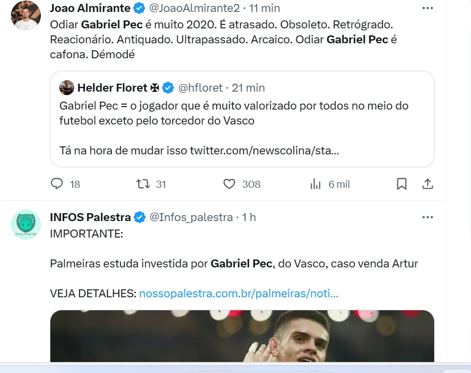 O portal NOSSO PALESTRA apurou outro ponta que interessa a Abel Ferreira. Trata-se de Gabriel Pec, um dos destaques do Vasco em 2023. O cria do Vasco tem mais bolas na rede – 8 gols – do que Enner Valencia (Internacional), Eduardo (Botafogo), Arrascaeta e Gabigol (Flamengo) no Campeonato Brasileiro.