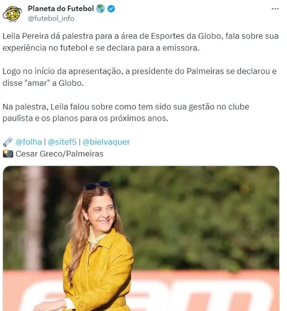 Logo no início da apresentação, a presidente do Palmeiras se declarou e disse “amar” a Globo. Na palestra, Leila falou sobre como tem sido sua gestão no clube paulista e os planos para os próximos anos. Vale lembrar que 2024 será ano de eleição e ela deve concorrer para se manter no poder alviverde.