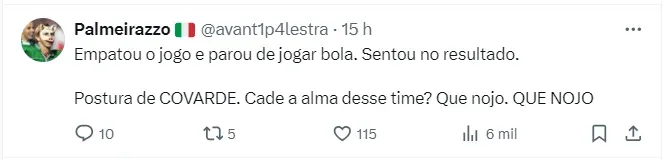 “Hoje foi uma vergonha o que vimos no Morumbi. Primeiro um pênalti absurdo e depois o árbitro foi ao VAR no pênalti do Luciano e se acovardou. Olha, a agressão ao Pablo que quase arrebenta o moleque era para vermelho direto, ele deu amarelo, mas e o VAR?“, declarou.