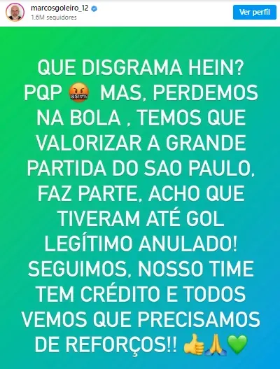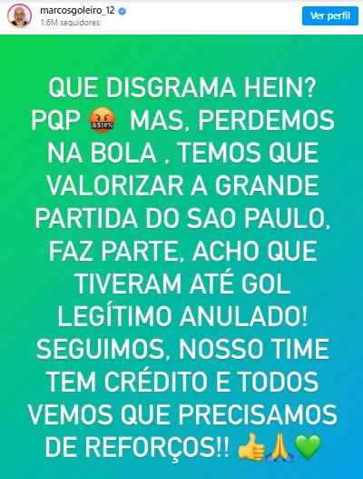 “Que disgrama, hein? Mas perdemos na bola, temos que valorizar a grande partida do São Paulo. Faz parte. Acho que tiveram até gol legítimo anulado. Seguimos! Nosso time tem crédito e todos vemos que precisamos de reforços”, escreveu Marcos em seu Instagram.