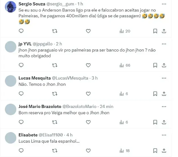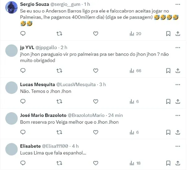 “Antes do Corinthians, sim, agora não mais. Não é por rivalidade, é pq ele foi muito fraco no rival, não faria sentido.”, comentou um torcedor, que logo foi rebatido: “Mas é ai que fica bom, pq ele tem potencial, palmeiras paga em dia e pode sair por um preço mais baixo por estar desvalorizado”.