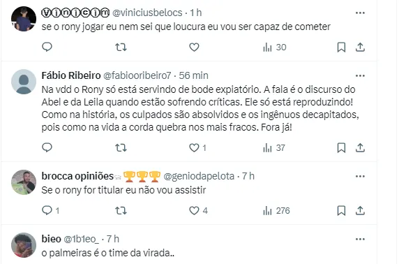Primeiro, Rony, que fez um desabafo recente, segue na reserva. O camisa 10 revelou que segue no Alviverde Paulista e vai buscar seu espaço. No entanto, Abel Ferreira tem duas dúvidas para o jogo.