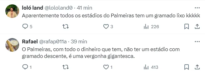 Muitos palmeirenses aproveitaram o post para compararem e declararem suas indignações com o Allianz Parque e a Arena Barueri, as ‘casas’ do Palmeiras em 2024. “O Palmeiras, com todo o dinheiro que tem, não ter um estádio com gramado descente, é uma vergonha gigantesca”, escreveu dos Palestrinos na publicação.