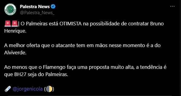 Na manhã deste sábado (30), ele revelou que a melhor oferta que o atacante tem em mãos até o momento é a do Palestra. Isto é, ainda segundo Nicola, a tendência é que Bruno Henrique seja jogador do Palmeiras em 2024, a não ser que o Flamengo faça uma proposta muito alta em termos de valores. Posto isso, o próximo jogo do Verdão será no próximo domingo (1), fora de casa, contra o Red Bull Bragantino.