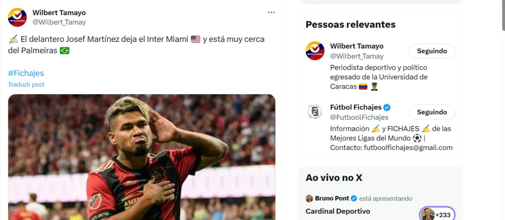 Na contramão, a imprensa venezuelana coloca o experiente Josef Martínez na mira do Verdão. O atacante de 30 anos deixou o Inter Miami, de Lionel Messi, e está livre no mercado. Segundo o colega Wilbert Tamayo, do portal Fútbol Fichajes, o centroavante “estaria muito próximo do Palmeiras”. A tendência é que a saída do jogador tem ligação para possível chegada de Luís Suarez ao time da Major League Soccer (MLS).