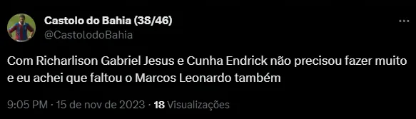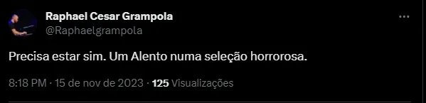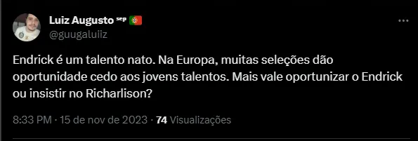 “O meu pensamento de Seleção é que têm que estar ali os caras que você tem que confiar. Por isso que, quando o Endrick foi convocado, eu fiquei surpreso. Ele fez muito pouco para estar na Seleção, como outros que estão sendo convocados”, disse Zinho.