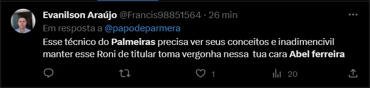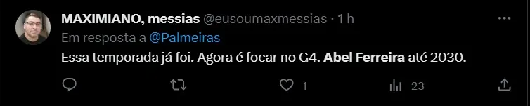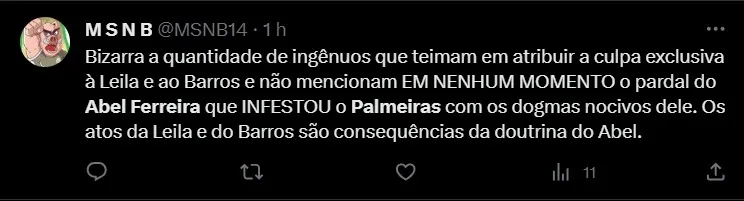 Leila vem ressaltando que tem a intenção de renovar com Abel Ferreira. Mas, os protestos realizados pelos torcedores podem interferir diretamente nisso, já que o português pode ser incluído nas manifestações. “Abel tem contrato conosco até dezembro de 2024, conversei com ele sim, que é um desejo muito grande que tenho que ele fique comigo até o final do meu segundo mandato, se eu for reeleita. Ele não fala que sim e nem que não, mas eu vejo que o Abel está muito feliz aqui no Palmeiras. Não há dúvida que ele também fica chateado, que alguns têm a memória muito curta. Abel é o maior treinador da história do Palmeiras, mas ele não tem obrigação de vencer todos os campeonatos. Eu volto a falar da violência. Se chega nos atletas, na presidente, claro que ele tem receio que chegue nele”, apontou.