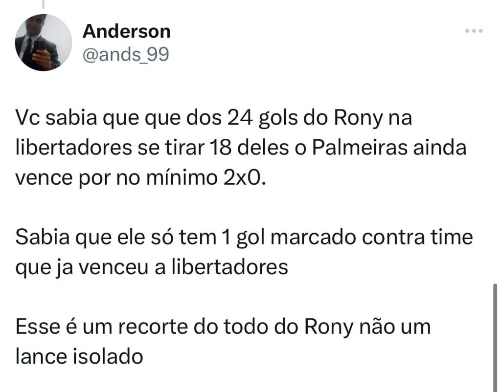 Quem vem sendo muito criticado é Rony. O camisa 10 do Palmeiras, desde o Campeonato Estadual disputou 38 jogos, marcou apenas 7 gols e deu quatro assistências. Para piorar, o centroavante só conseguiu ser efetivo com equipes em baixa no Brasileirão, como Coritiba e América Mineiro, além de Bolívar e Deportivo Pereira. Porém, o que joga a favor do profissional é que tanto a comissão técnica quanto a diretoria estão do lado “Rústico”.
